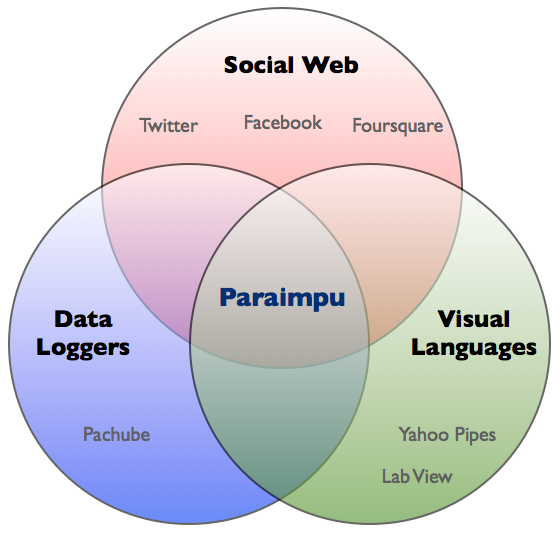 Nella nostra visione, Paraimpu non si pone in antagonismo a sistemi del genere, piuttosto si colloca esattamente nell’intersezione di questi, potendo di fatto colloquiare con essi, cercando di semplificarne al massimo l’utilizzo e di rendere veramente sociale la condivisione dei dati e degli oggetti. Per esempio, è già possibile aggiungere uno stream di dati proveniente da Pachube mediante un Pachube Sensor in Paraimpu o connettere quest’ultimo a Facebook senza dover affrontare la relativa complessità di Yahoo Pipes.
