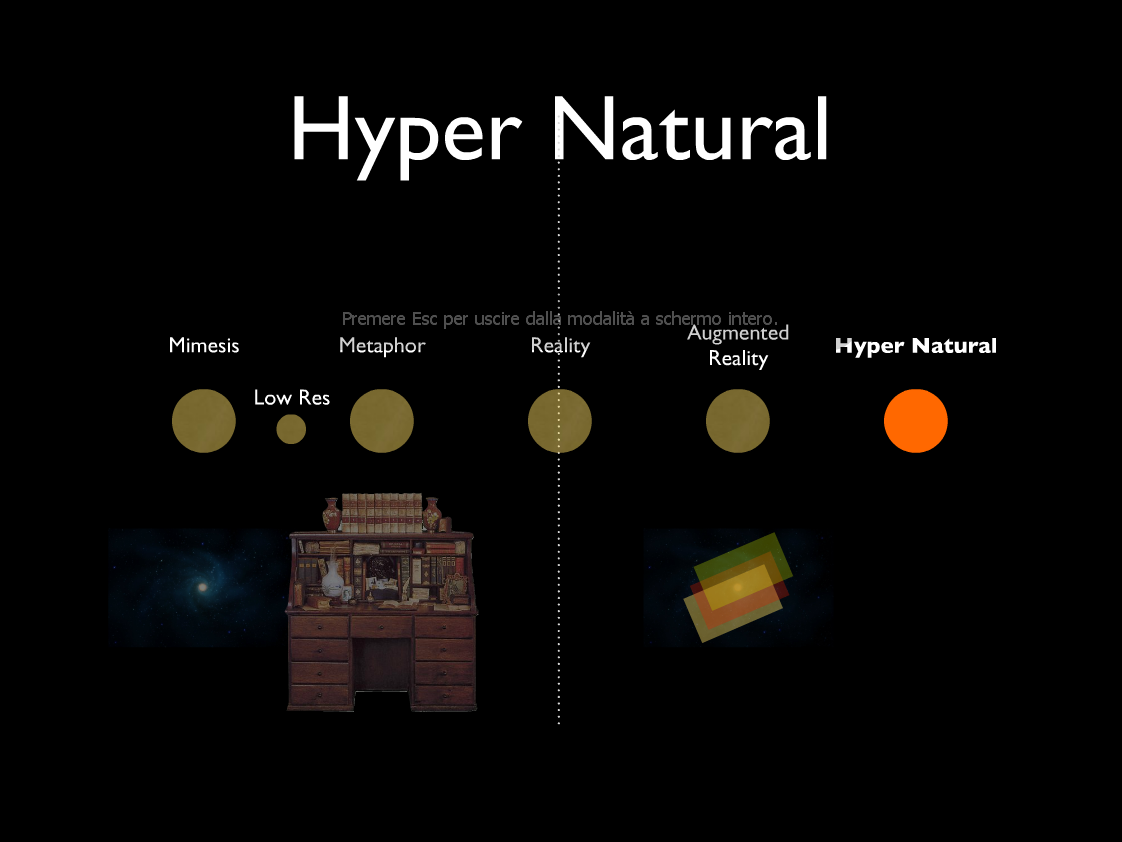 Non esiste dunque più alcuna distinzione tra dentro e fuori lo schermo e il senso del reale è definitivamente esteso ed in continua sovrapposizione ed estensione. L’hyper naturale è quindi un’estensione delle nostre funzioni vitali e di comunicazione dove i concetti stessi di vita, di relazione, di tempo, di spazio si ridefiniscono .