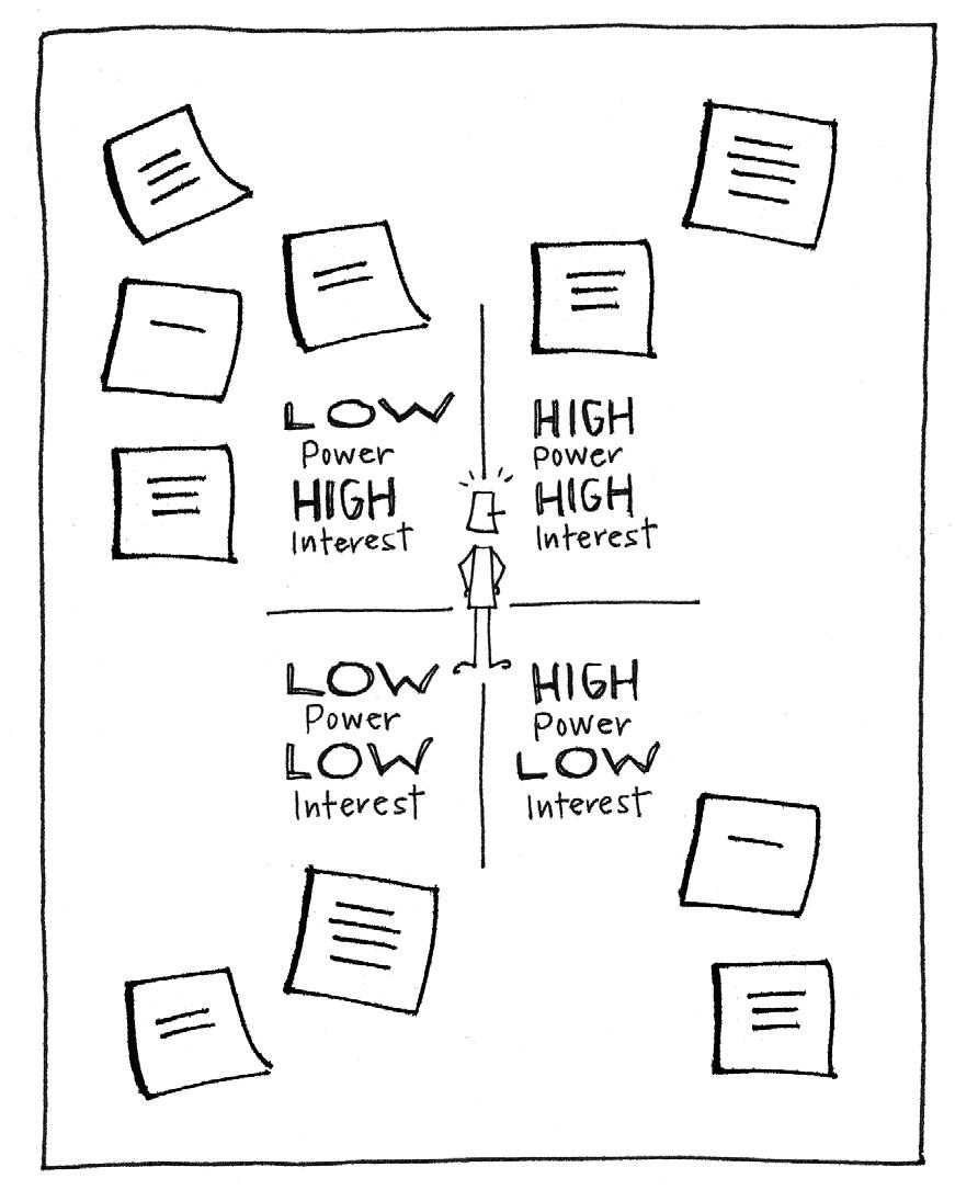 During the second day, we devoted our time to identify and classify stakeholders – previously mapped in a preliminary stakeholder map – into four quadrants based (see the image below, from the Gamestorming portal) on the potential impact and interest of each of them for the initiative. Having identified some 19 stakeholders, we then focused on those in the greatest interest and maximum impact quadrant (seven) and went ahead preparing a motivation matrix, a quite classic service design tool of extreme utility. The objective of the motivation matrix is to identify intrinsic and extrinsic motivations modeling who-gives-to-whom flows.